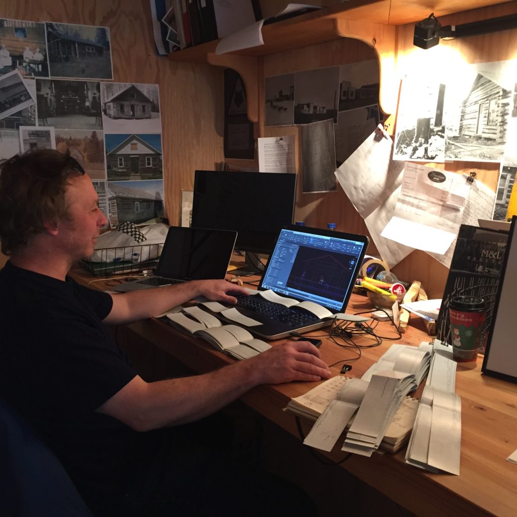 Inspecting wall logs at the QMS Chapel to inform repair work