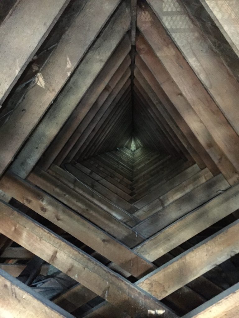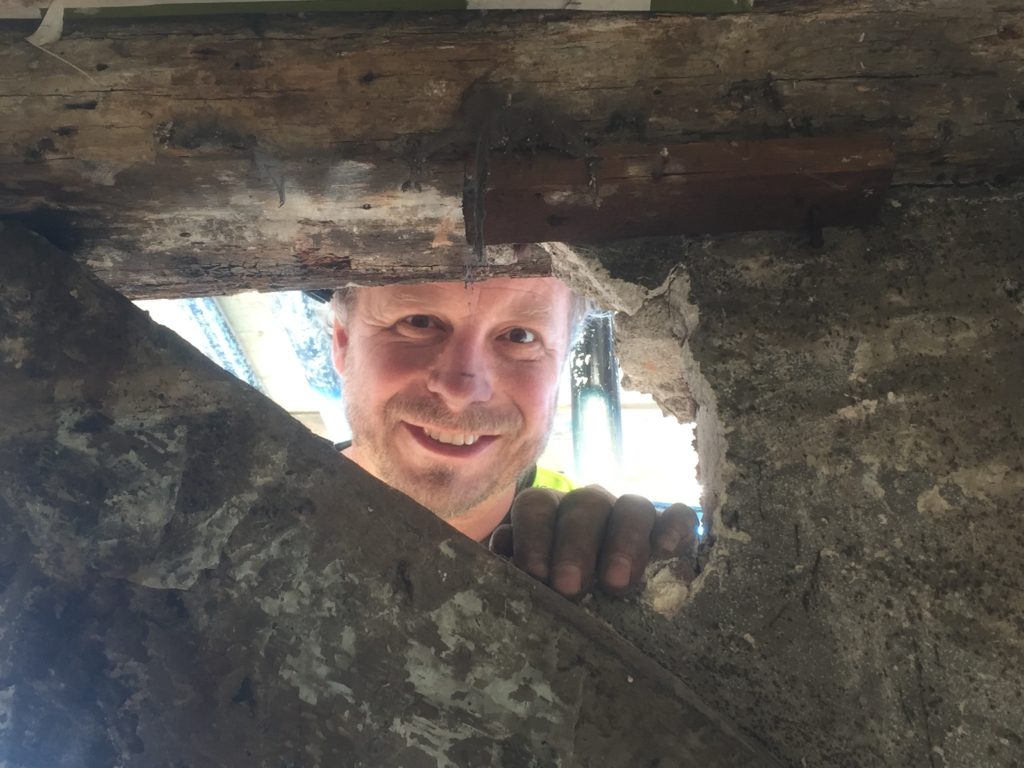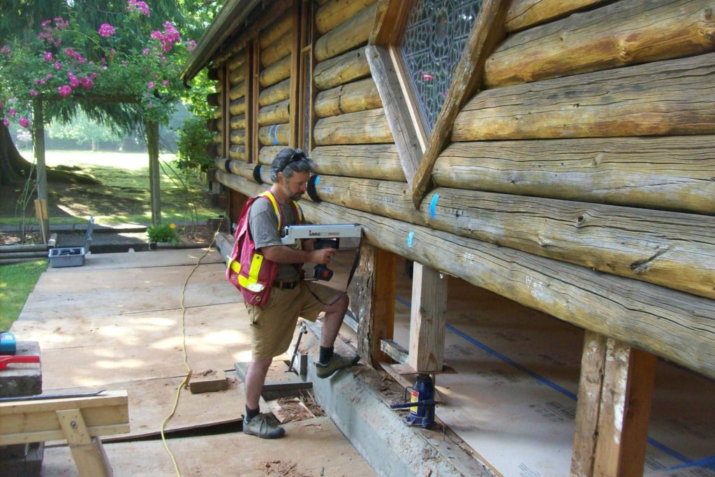 Inspecting wall logs at the QMS Chapel to inform repair work