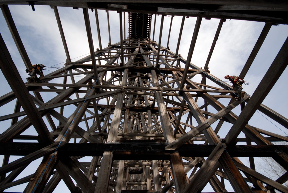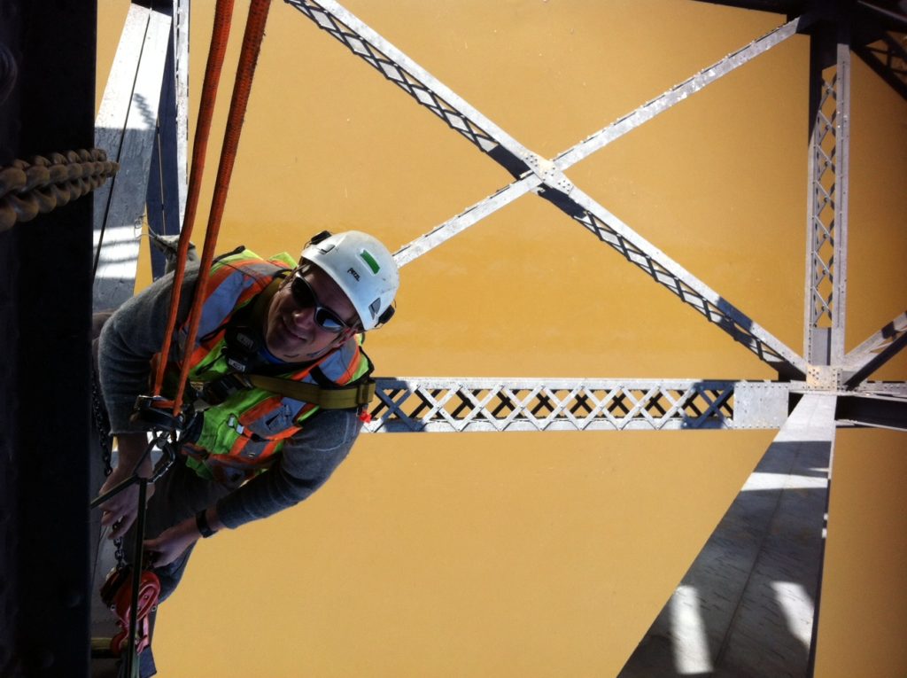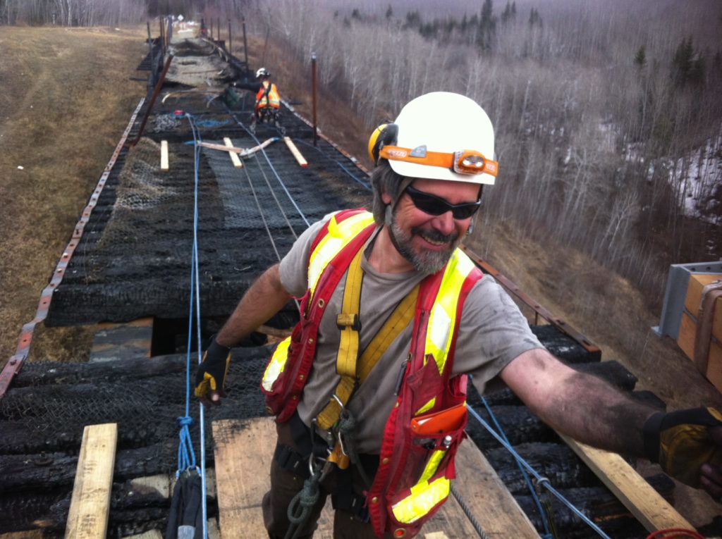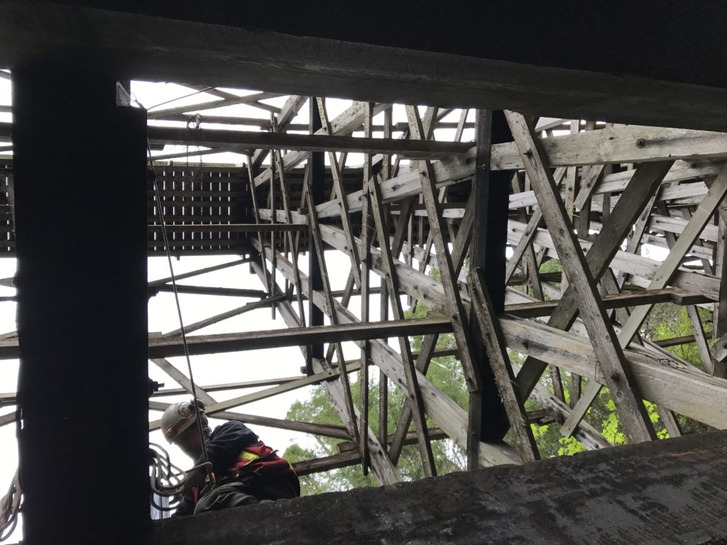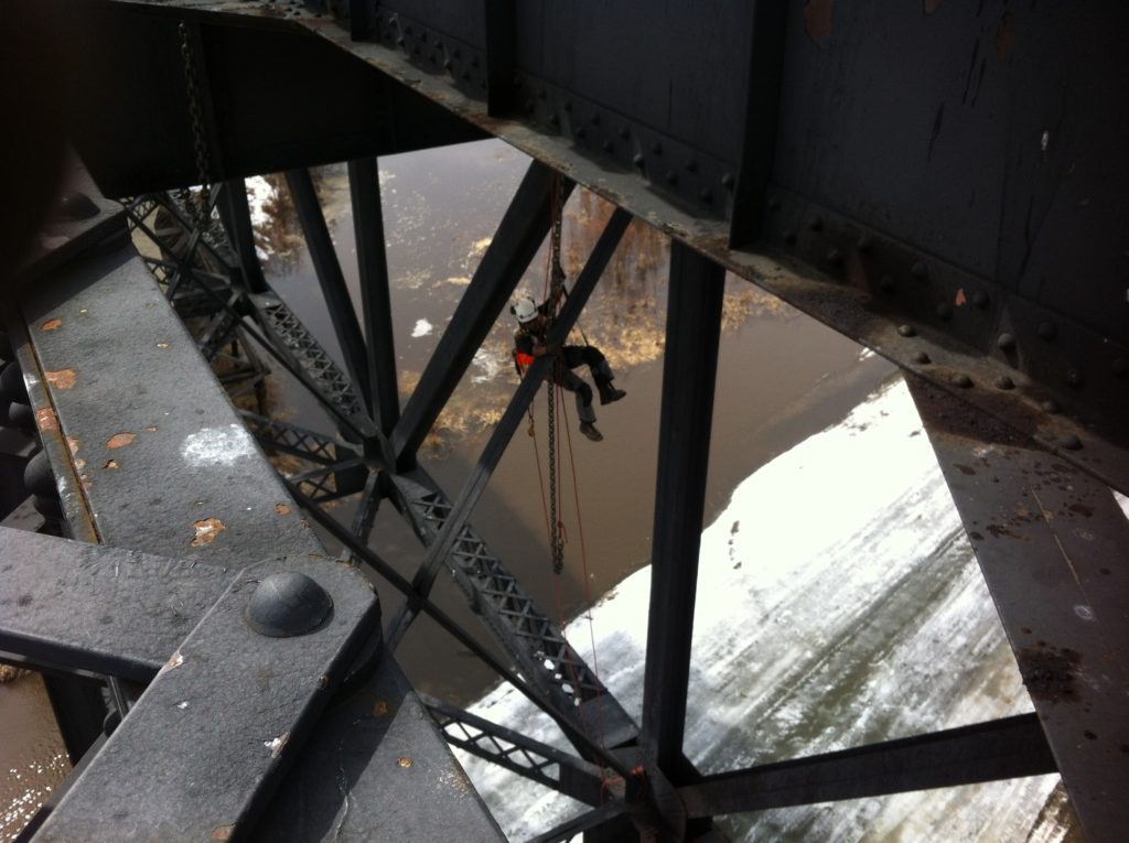 Pierre Moquin on ropes during assessment of Beaver River Trestle