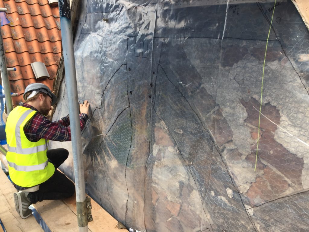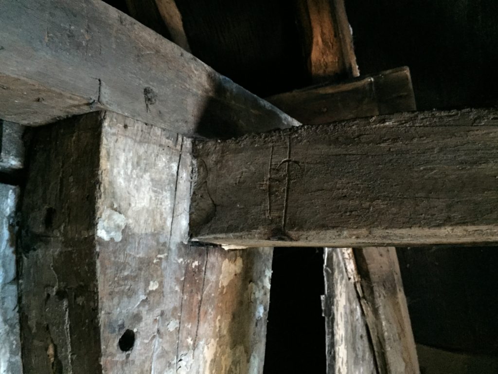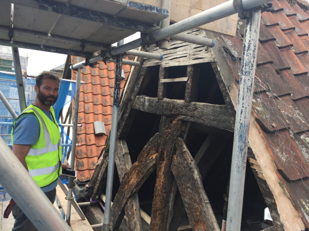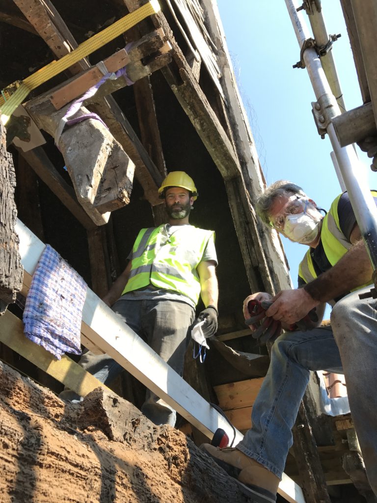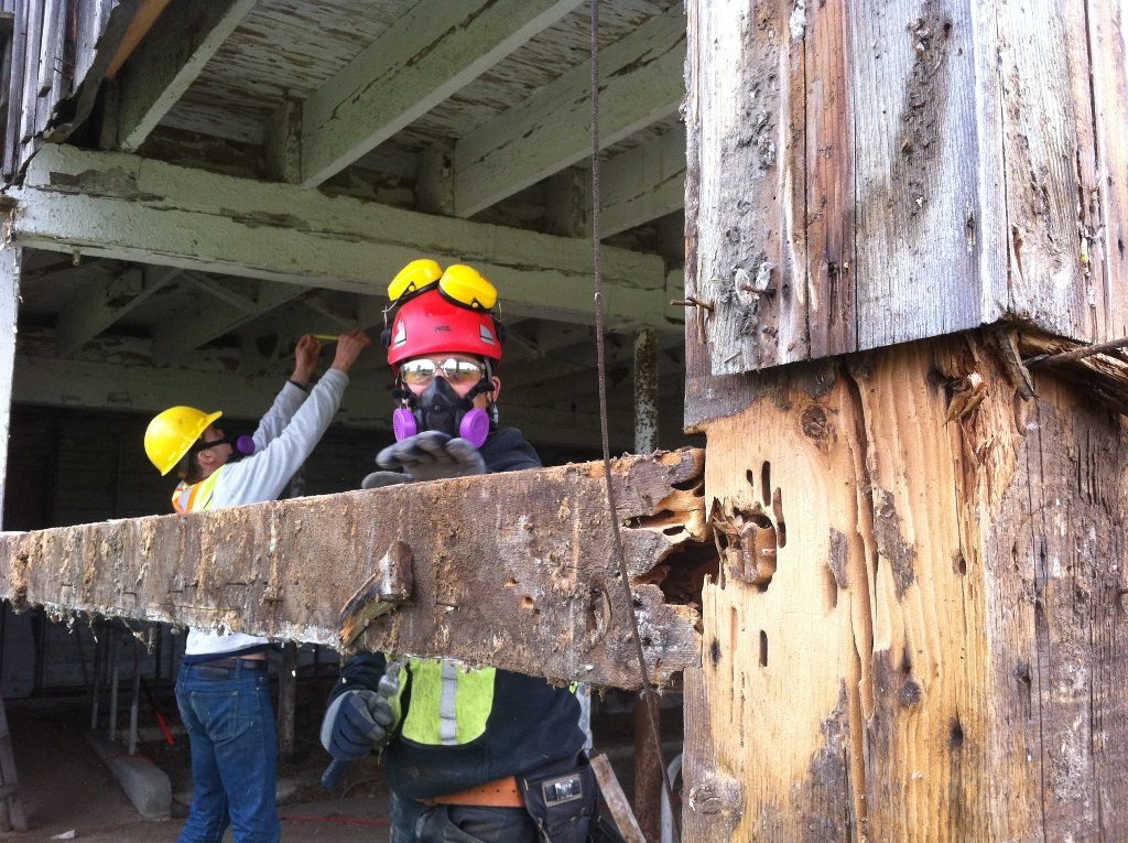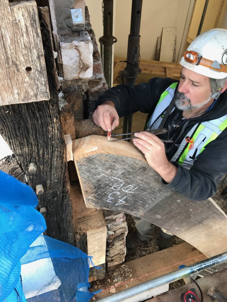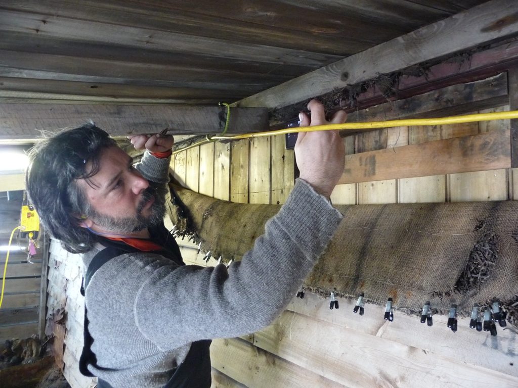 Fabrice Lallemand dismantles beams during the documentation of the Harris Barn