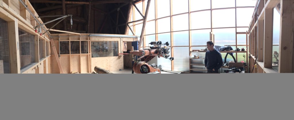 Charley Brentall scheming up new applications for the Kuka robot at Hooke Park, UK