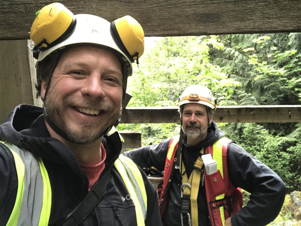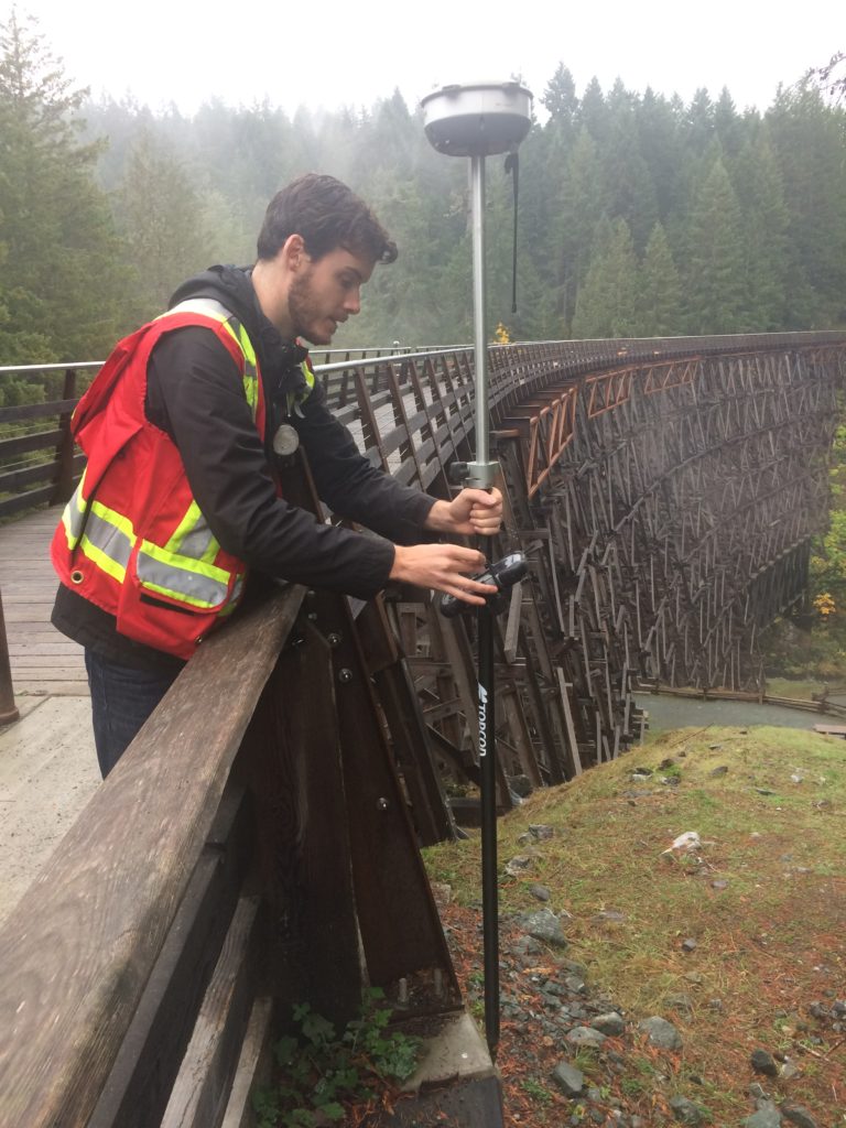 Graham Oglend uses GPS survey equipment at Kinsol Trestle