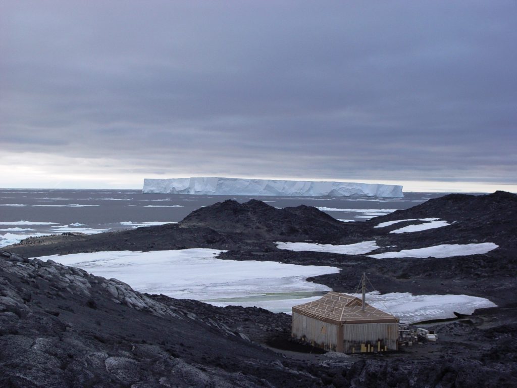 Tabular berg passes Shackleton’s Nimrod Hut at Cape Royds, Antarctica